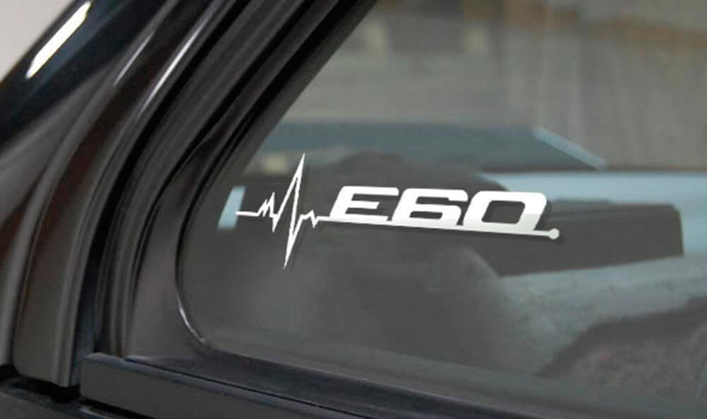 Un autocollant graphique unique sur la fenêtre de la BMW E60, un style unique avec nos autocollants en vinyle et des autocollants style BMW sur les fenêtres dans un style graphique avec un cardiogramme du pouls et le nom du modèle !