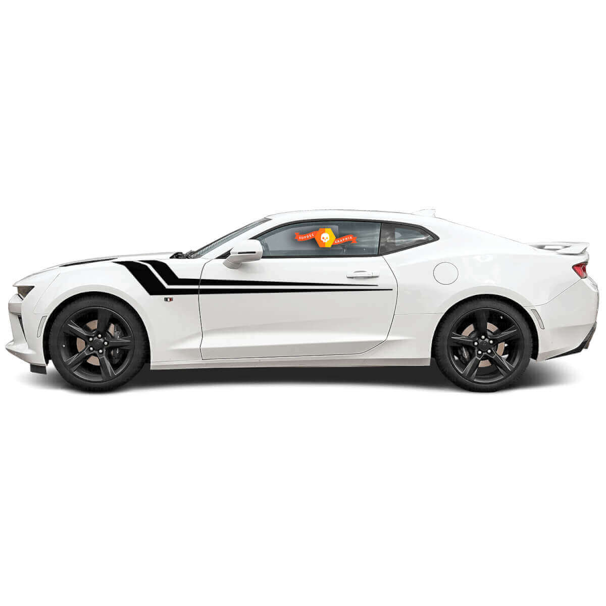 L’opportunité originale et unique se trouve uniquement sur notre site web pour les décorations vinyle automobile pour tous les modèles de voiture ! Nous vous présentons l’autocollant original pour l’aile avant destiné à l’installation sur une Chevrolet Camaro. L’autocollant en vinyle est fabriqué en vinyle de haute qualité et s’installe près de l’aile avant. L’autocollant pour carrosserie Camaro est composé de deux bandes obliques qui débutent au capot, se courbent et se prolongent en douceur le long des portières, jusqu’à l’arrière. Ce design crée un look dynamique et sportif, mettant en valeur les lignes de votre Camaro.